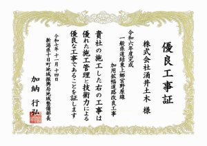 この度当社が施工いたしました「令和六年度完成 一般県道結東上郷宮野原線 加用拡幅道路改良工事」におきまして新潟県十日町地域振興局様より優良工事表彰及び優秀技術者表彰を受賞いたしました。この表彰は施工品質、技術力、安全管理 […]